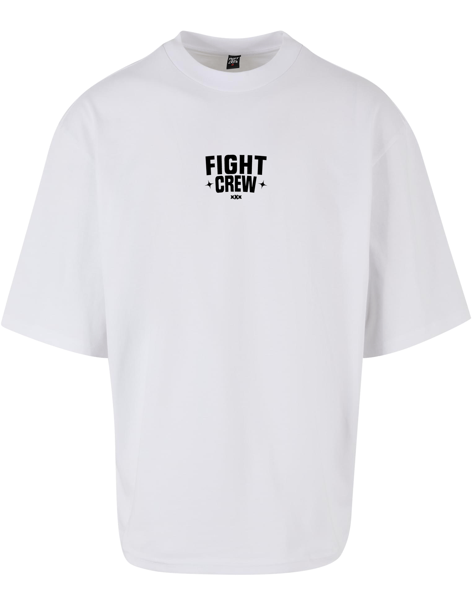 The Fight Crew's short sleeve cotton jersey T-shirt in white. This tee stands out with its relaxed fit and distinctive oversized sleeves. Logo printed in black on the center of the chest. Classic art of two boxers printed in black on the back. Fits oversized, it is recommended to order 1 size smaller than normal.